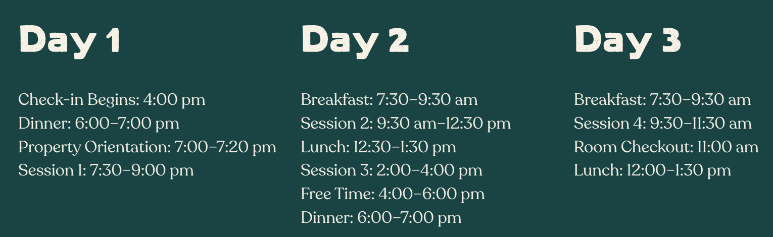 Over the course of a weekend retreat led by licensed psychotherapist Claire Dennis, you’ll explore both your innate inner wisdom and the unconscious patterns that keep you stuck. Set within an all-inclusive resort in the Blue Ridge Mountains, this retreat offers a rare, distraction-free space away from constant obligations, digital noise, and the onslaught of life — so you can reconnect with what actually matters to you. Through evidence-based experiential therapeutic exercises (using activities and visuals that go beyond talking), thought-provoking prompts, and carefully facilitated group conversations, Claire guides you toward greater clarity, self-trust, and a sense that you are in the driver’s seat of your life.
